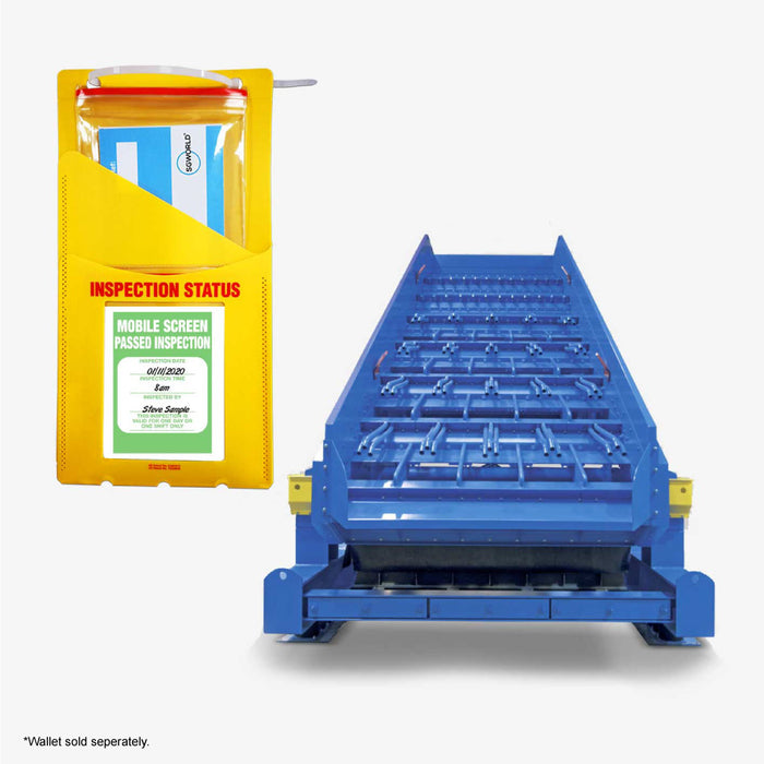 Once the inspection is complete, assuming safety has been established, the inspection certificate can be placed inside a safety status indicator wallet on or near the mobile screen within a display paddle ensuring that every employee can clearly see that it is safe for use. Faulty mobile screens can be similarly identified and taken out of service for maintenance.