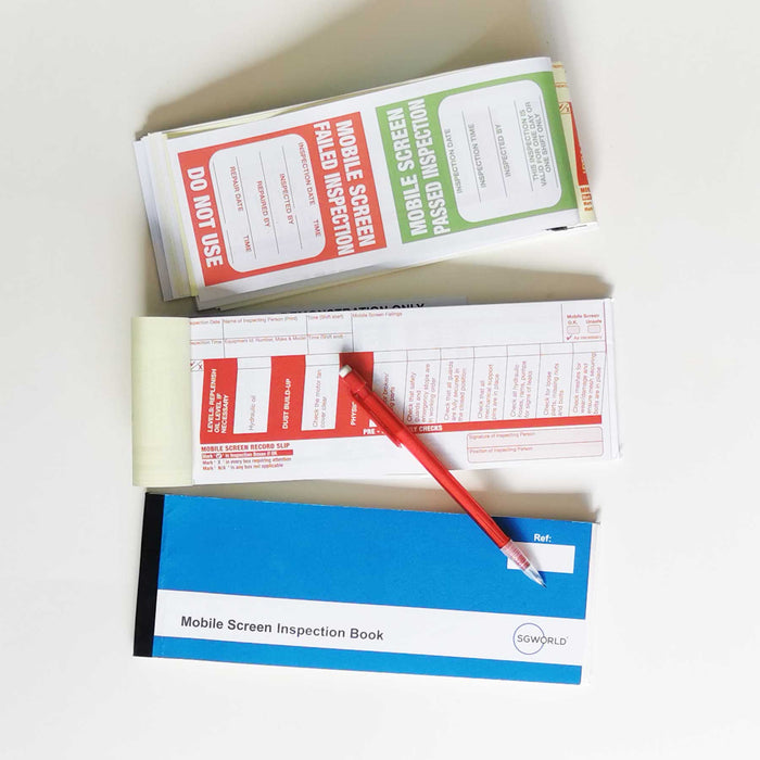 The mobile screen inspection pad enables an organisation to work through a duplicate checklist and carry out a pre-use inspection, ensuring the mobile screen is safe for use. The top copy of the checklist is displayed on or by the mobile screen to show that it has passed its inspection. The duplicate copy remains in the pad as evidence that the inspection has taken place in the event of an HSE investigation.