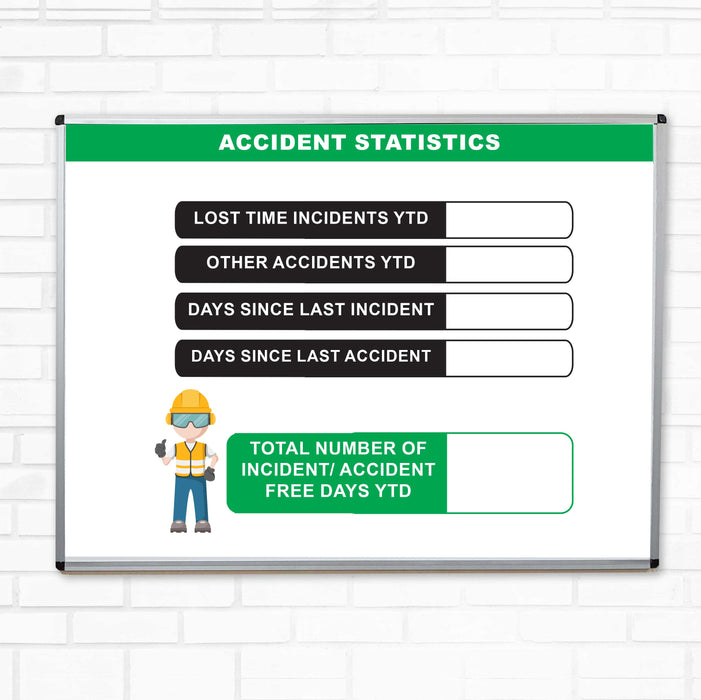 Informing your employees and your visitors about your safety performance is an important part of your Health & Safety process. These easy to use whiteboards allow you to update statistics on a daily basis, telling employees how well they’re doing and promoting to visitors how seriously your organisation takes Health & Safety performance.