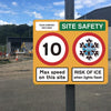 Offer a dual purpose warning, that incorporates an on-site speed message, along with a risk of ice warning message. Ideal for parts of a company site that has heavy plant and pedestrian walkways. Corporate colours and logos are available.