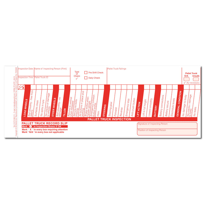 The pallet truck inspection pad helps businesses perform their pre-use or daily safety inspections. The checklist is designed to help you comply with your duty of care under HSE guidance and PUWER. The duplicate checklist design creates two signed copies of each inspection and incorporates a PASS/FAIL notice. Each pad has 30 checklists and is used in tandem with a hi-vis display wallet
