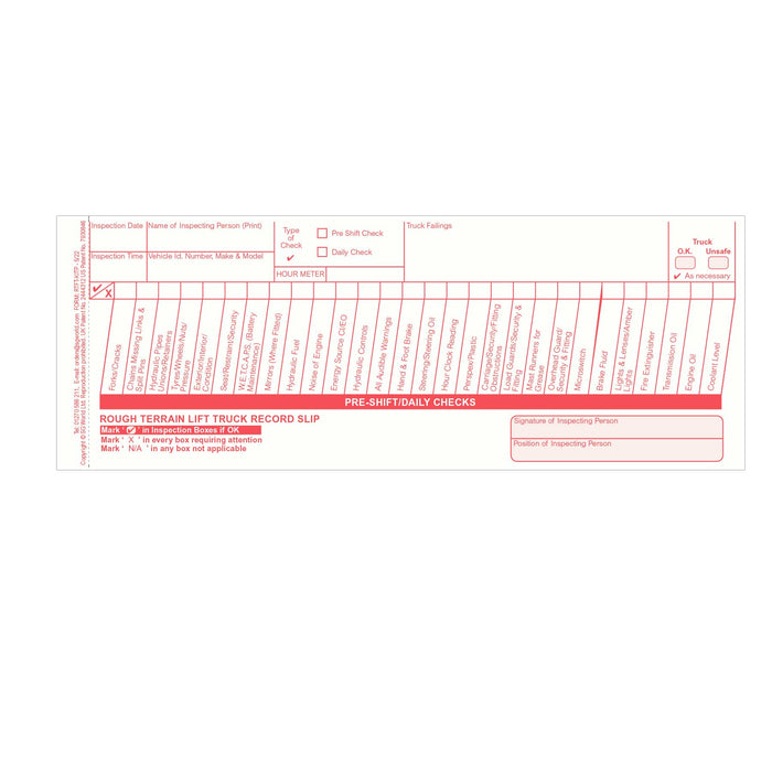 Before every shift, the operator of the truck can simply work down the inspection checklist, checking the safety of each component in turn. Once the inspection is complete, assuming safety has been established, the green PASS inspection certificate can be placed inside a safety status indicator on the truck ensuring that everyone can clearly see that the truck is safe for use. Failing rough terrain trucks can be similarly identified by a red FAIL certificate and reported for maintenance. The duplicate copy of the certificate remains inside the inspection pad and can be used as evidence of inspections should you ever need to produce this for the HSE or other official parties.