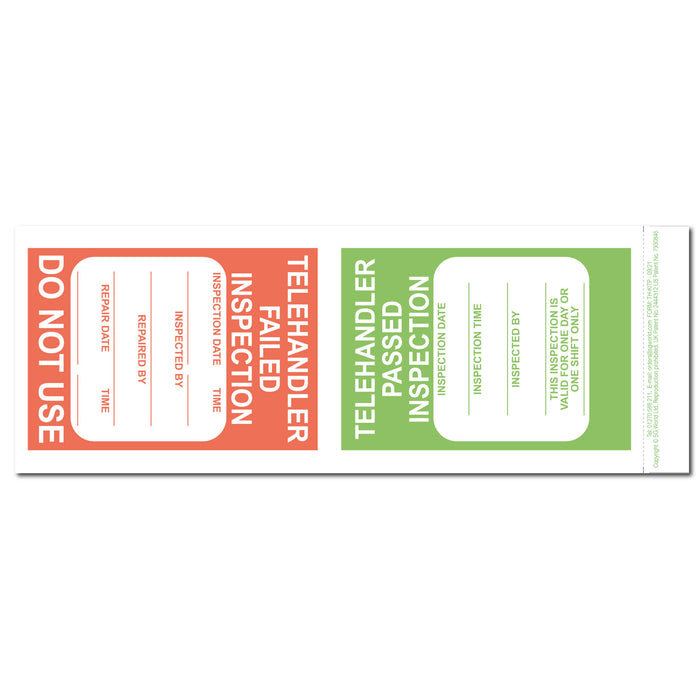 Before every shift, the operator of the telehandler can simply work down the inspection checklist, checking the safety of each component in turn. Once the inspection is complete, assuming safety has been established, the green PASS inspection certificate can be placed inside a safety status indicator on the telehandler ensuring that everyone can clearly see that the telehandler is safe for use. Failing telehandlers can be similarly identified by a red FAIL certificate and reported for maintenance. The duplicate copy of the certificate remains inside the inspection pad and can be used as evidence of inspections should you ever need to produce this for the HSE or other official parties.