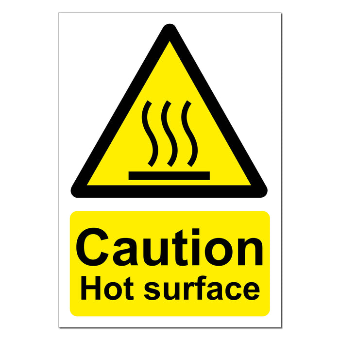 Our Caution Hot Surface Safety sign is a warning category sign conforming to the BS5499 standard. These health and safety signs are required by the Health and Safety (Safety Signs and Signals) Regulations 1996. A warning sign will appear as a black banded, yellow, equilateral triangle with the type of hazard picture in black, positioned centrally on the sign.