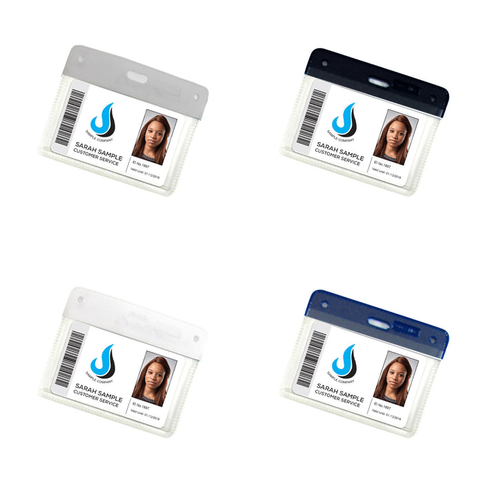 A clear ID card wallet in flexible, soft 190 micron plastic with a coloured plastic top for displaying standard, landscape format ID cards at a maximum size of 95mm width x 80mm height. The wallet has a convenient space to attach metal clips or lanyards.