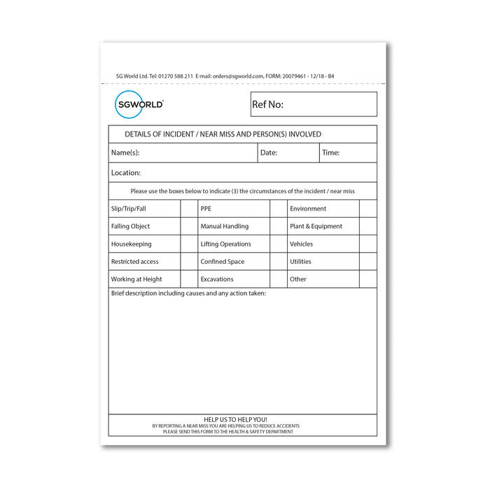 - Quick & Easy to Use: Pre-formatted sections for key information like name, location, time, and near-miss details facilitate prompt and accurate reporting.